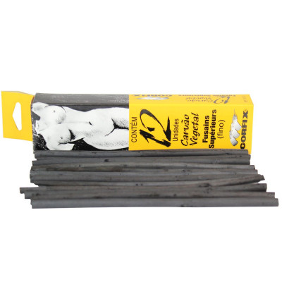 Caixa de carvão vegetal com 12 (doze) unidades de carvão de espessura fina. Especial para trabalhos em papel ou tela. Material versátil indicado para estudos, esboços, aplicação com técnicas mistas e trabalhos artísticos finalizados. Recomendamos uso de verniz spray fixador para preservação do desenho de carvão sobre papel.
