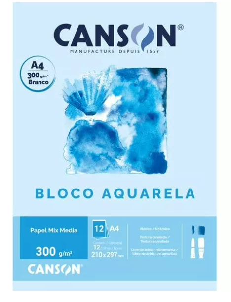 O Bloco Aquarela possui um papel artístico naturalmente branco, de alta gramatura e dupla face. Ideal para estudantes universitários que buscam por um papel livre de ácido, colado na massa, com reserva alcalina, sem branqueador ótico e com uma leve textura que valoriza e facilita a sua arte com aquarela, guache, acrílica, giz pastel, giz oleoso, lápis de cor grafite e carvão.