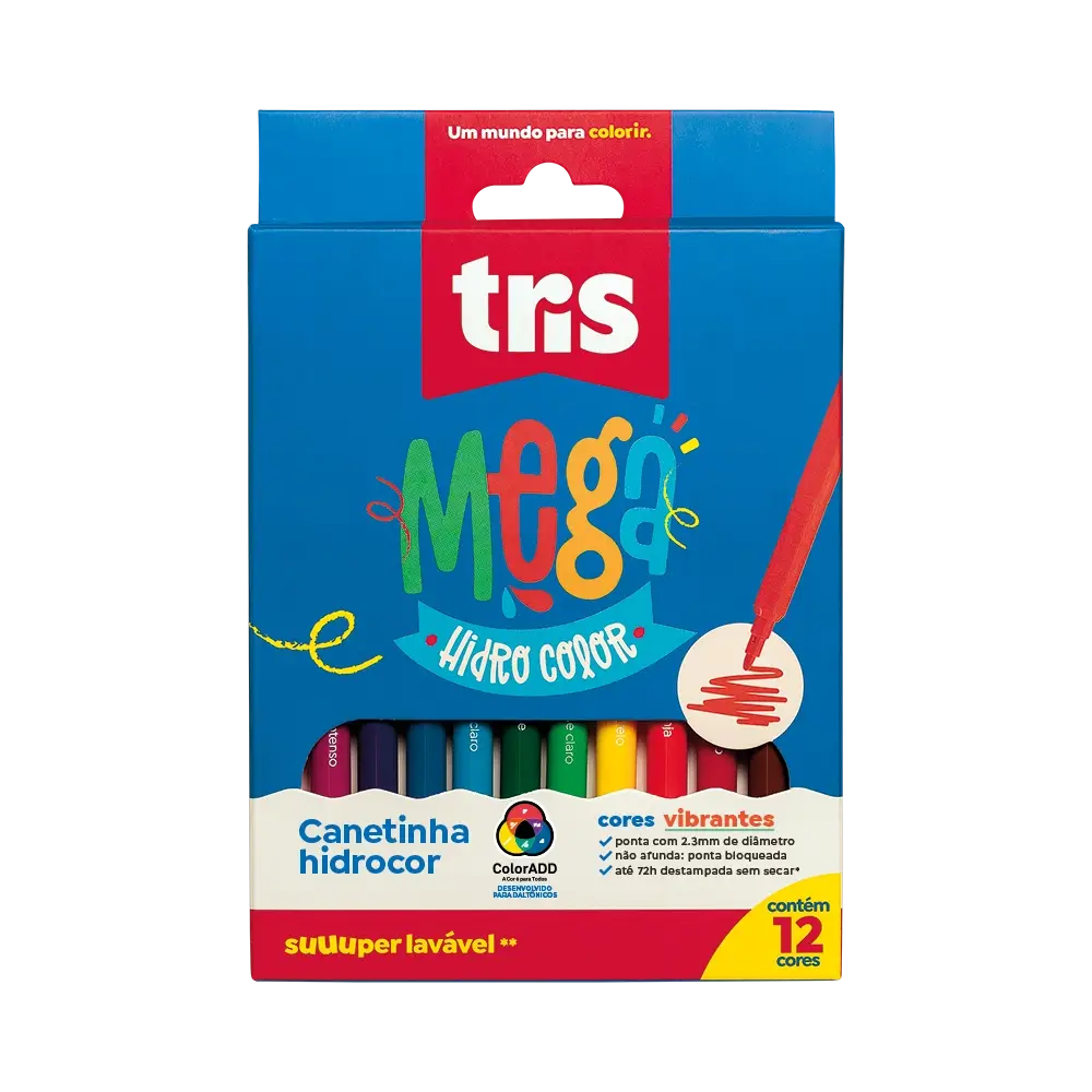 MEGA divertido! MEGA colorido! A linha de colorir MEGA da TRIS é uma alternativa de qualidade para potencializar a criatividade dos seus usuários. Cores ultra intensas! Fica até 72h destampada sem secar; possui ponta bloqueada e tinta super lavável. As canetinhas hidrocores possuem ponta de 2.3mm, o nome das cores e código ColorADD no corpo. A ColorADD é uma linguagem universal que ajuda daltônicos a identificar cores. Com símbolos representando cada cor, a paleta se torna acessível aos daltônicos, trazendo mais cor à vida das pessoas. Conjunto com 12 cores incríveis.