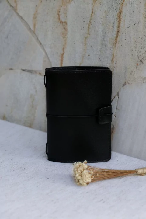 O Midori de Bolso é uma capa em material sintético reutilizável e permanente, com design exclusivo e autoral, ele vem com 1 elásticos onde você pode colocar até 1 journal de bolso. Todas as capas possuem dois bolsos, ideais para guardar documentos e até mesmo um leitor digital como Kindle, também possuem uma porta canetas na lateral, todas nossas capas são costuradas à mão em couro sintético.