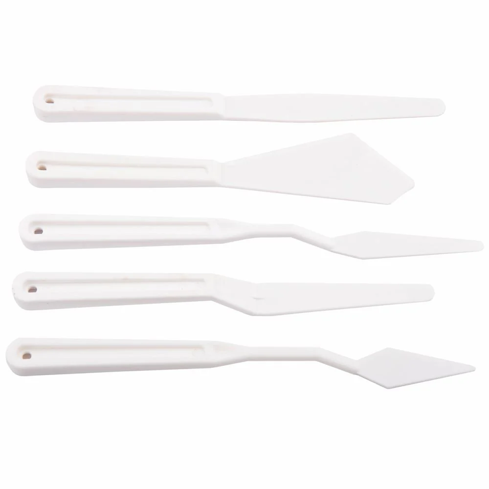 Conjunto com 5 espátulas plásticas para pintura Sinoart, em tamanhos e formatos elaborados para melhor atender as necessidades do artista. Leve e com alta elasticidade, durável em todas as técnicas de pintura.