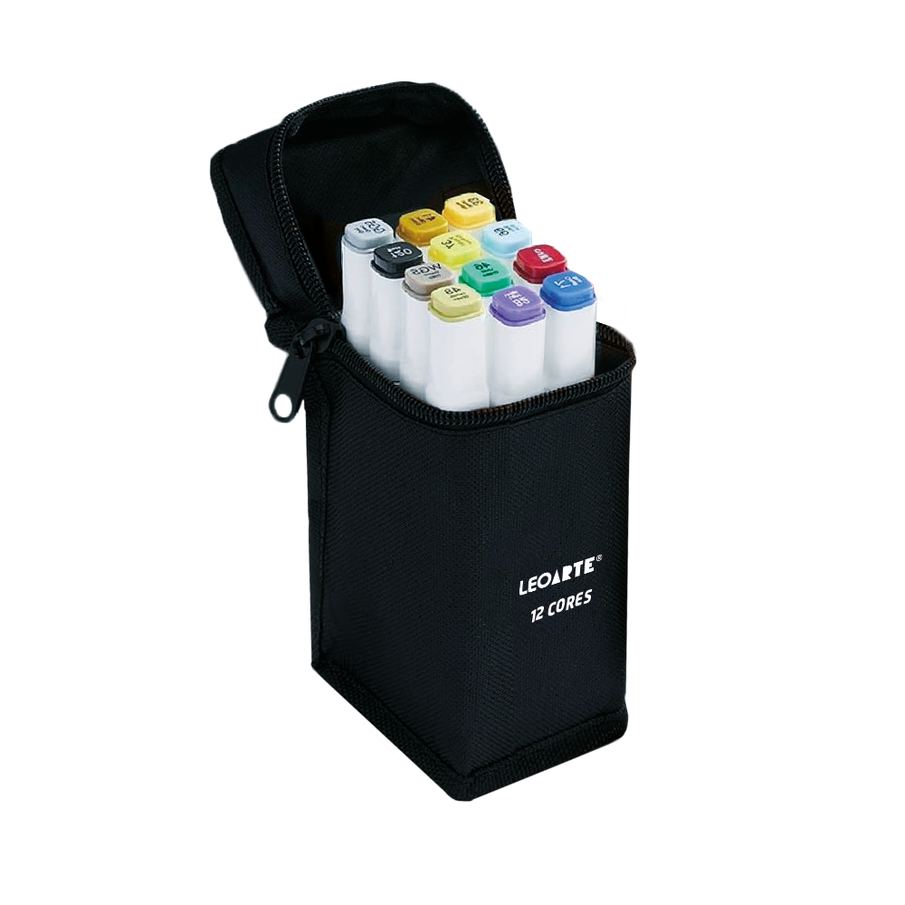 Estojo de Caneta Marcador Ponta Dupla Permanente Base Alcool LEOART - 12 Cores