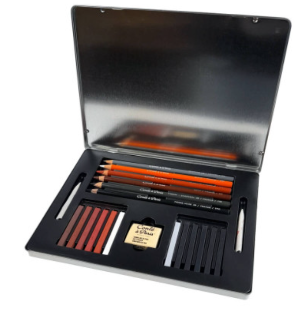 Estojo de lápis Conté à Paris Sketching Pencils & Crayons é um estojo para desenho completo com os principais lápis graduado e crayons, alén de esfuminhos e barras crayons e carvão.