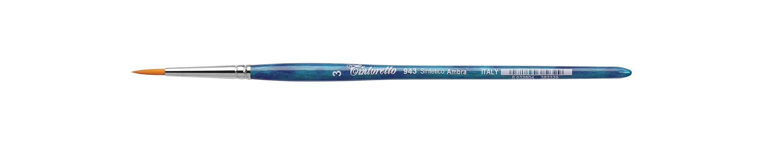 SÉRIE 943 - Pincel redondo, âmbar sintético. Ponteira de latão niquelado. Cabo curto de madeira pintado de azul.