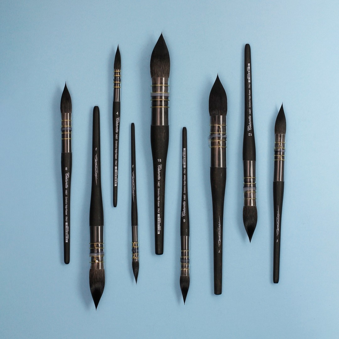 Pincel tradicional com um design redefinido para a era moderna. Possui os recursos mais avançados em todos os aspectos. Realizados com a colaboração e o precioso suporte técnico da aquarelista e ilustradora profissional Felice Feltracco , esses pincéis são concebidos especialmente para satisfazer as necessidades extremas dos aquarelistas modernos: ponta notavelmente fina, alta retenção de cor, elasticidade apreciável para o retorno da ponta. Ao contrário dos pincéis tradicionais de pelo de esquilo em pena natural, a série 1407 é 100% Cruelty Free, já que a virola é feita de material plástico e as fibras são completamente sintéticas. Além disso, o cabo é realizado com um verniz especial que penetra na madeira, tornando-o impermeável, evitando quebras e rachaduras típicas da superfície, também antiderrapante para maior aderência no cabo a fim de garantir a máxima precisão.