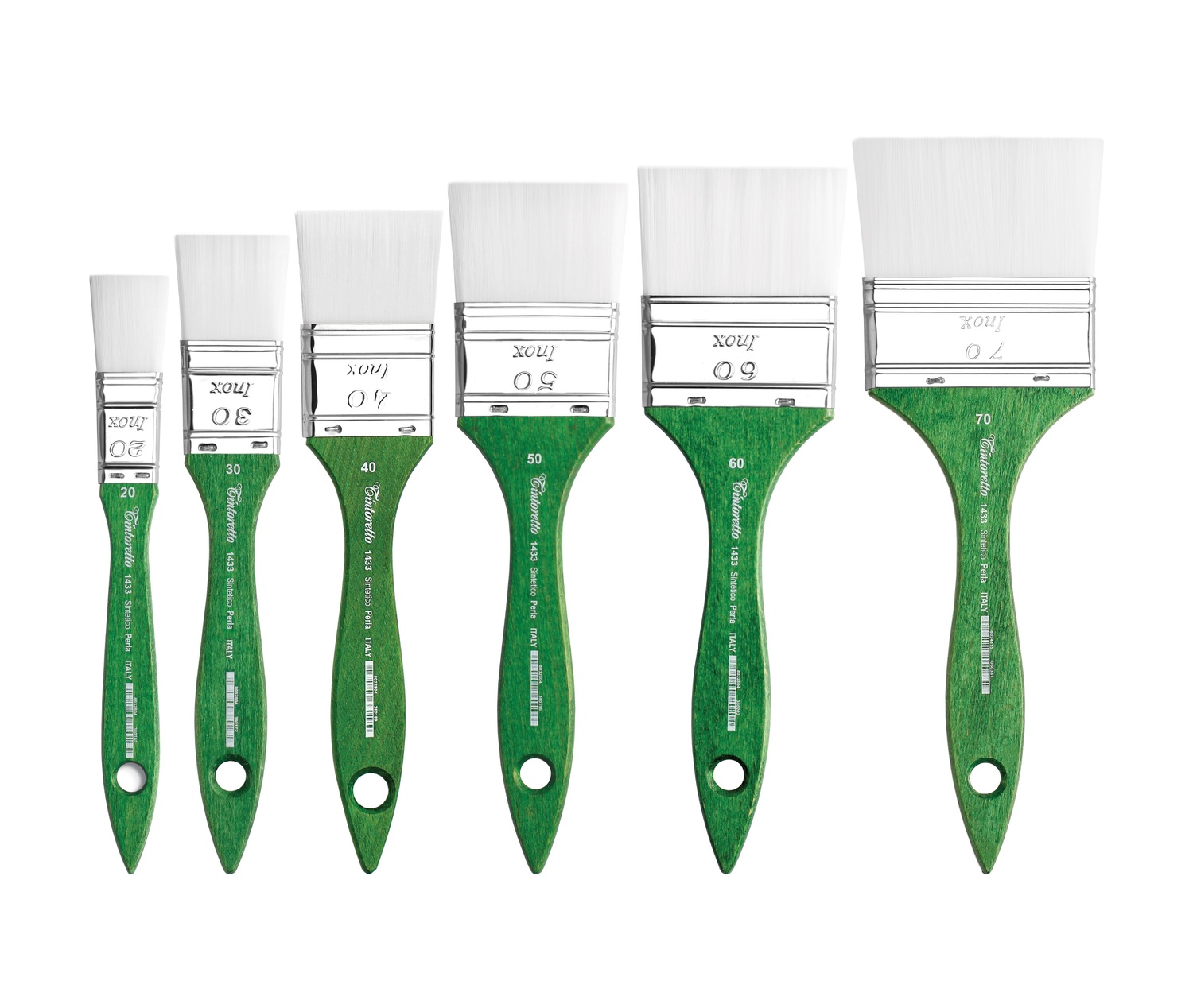 Pincéis chatos feitos de vários tipos de fibras sintéticas com diferentes propriedades para diferentes técnicas de pintura, desde primers espessos a óleo ou acrílico até tintas têmpera fluidas, mas também para pintar qualquer superfície ou aplicar cola para decoupage. Produzem uma pincelada mais uniforme do que as cerdas naturais.