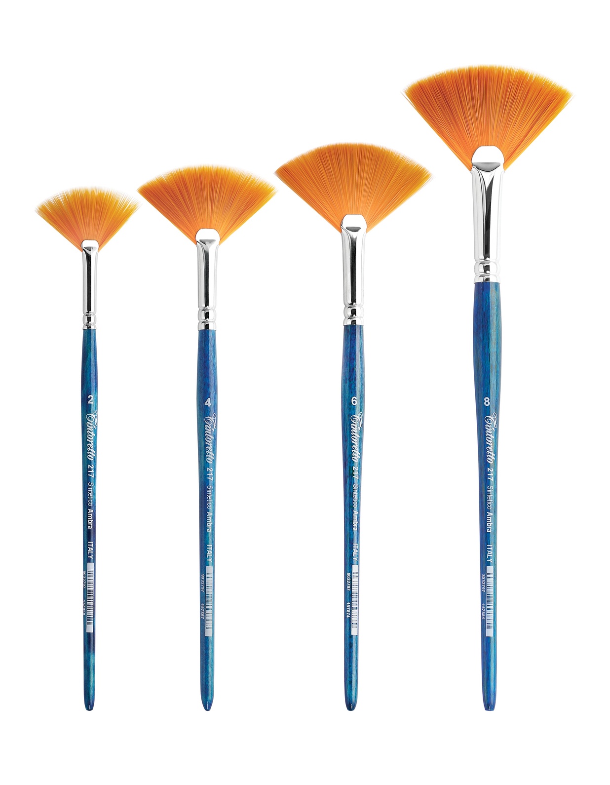 Pincel leque, âmbar sintético. Virola em latão niquelado. Cabo curto de madeira pintado de azul