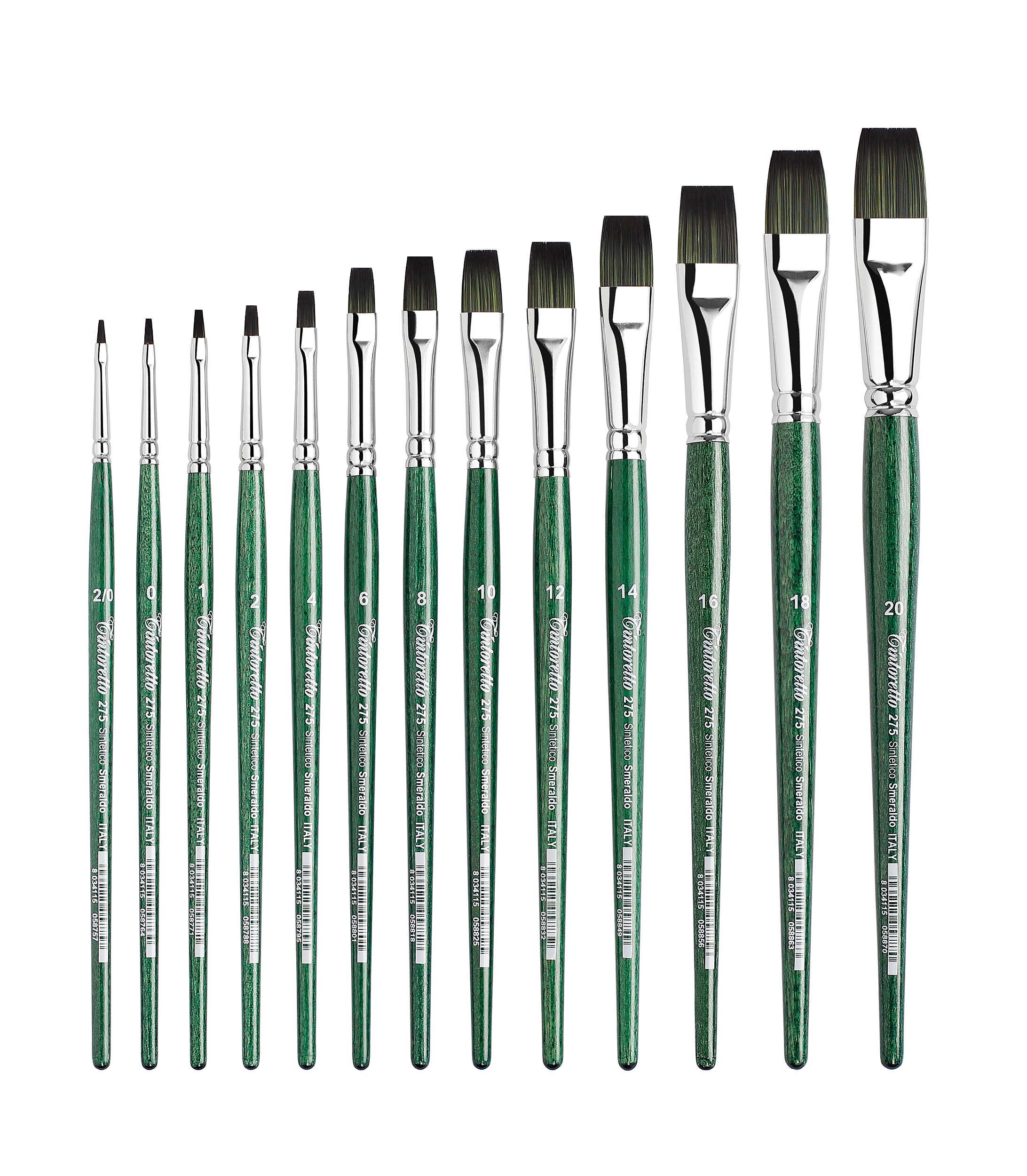 SÉRIE 275 Pincel chato, esmeralda sintética. Ponteira de latão niquelado. Cabo curto de madeira envernizada verde.
