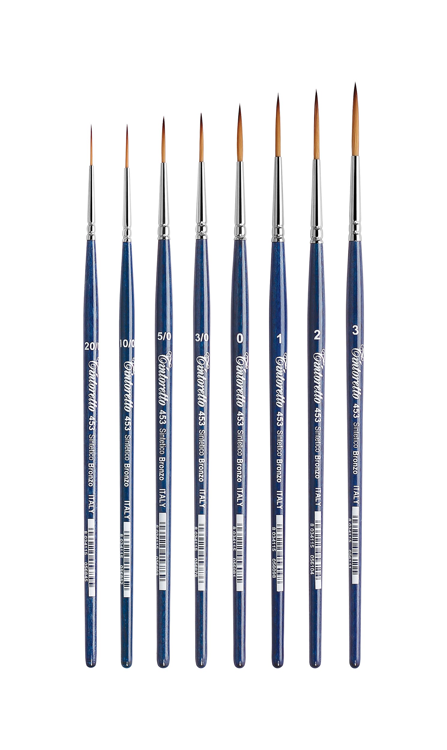 SÉRIE 453 - Pincel redondo de pelo extra longo, fibra sintética bronze. Virola de latão niquelado. Cabo curto de madeira, envernizado em azul.