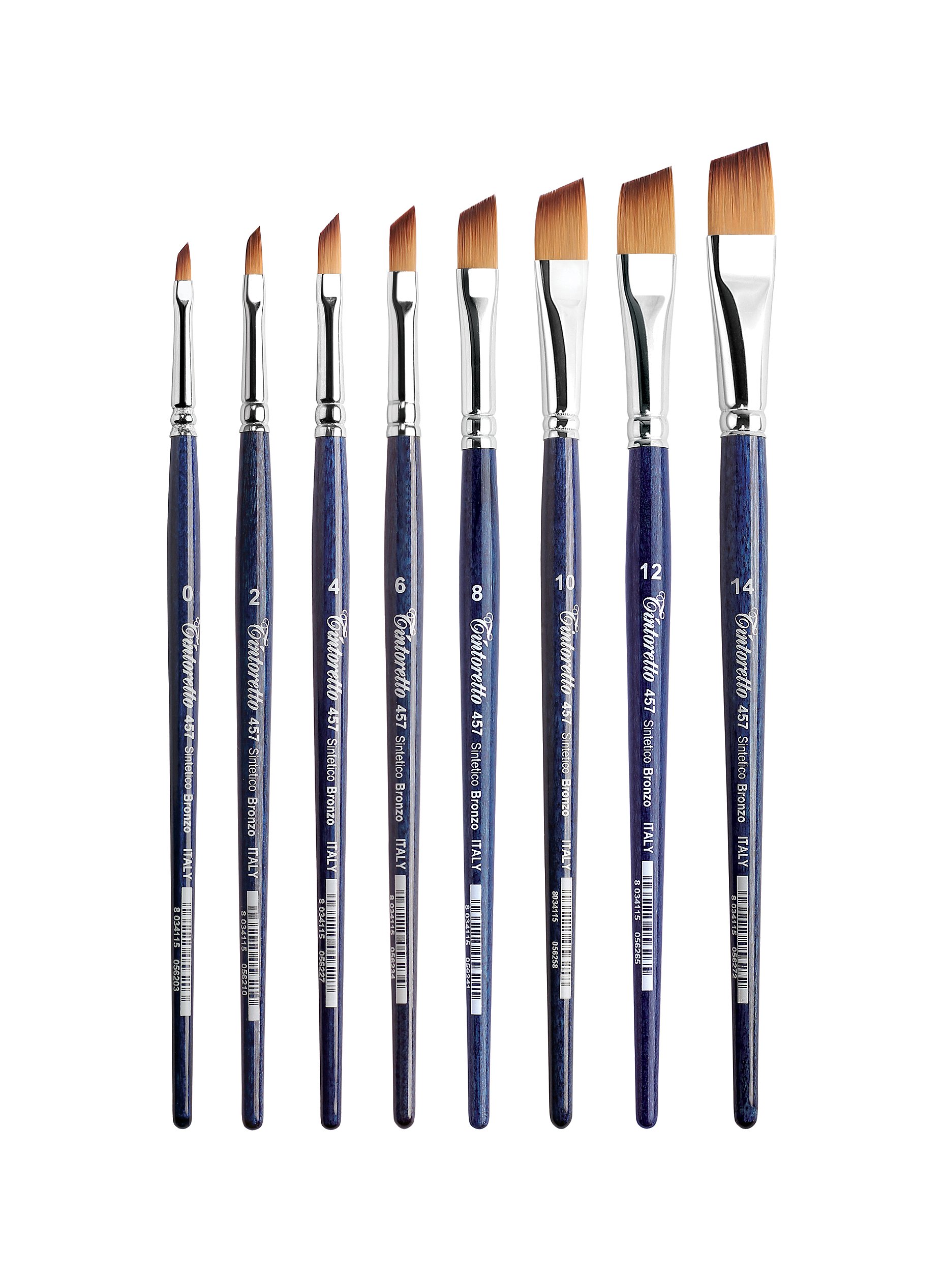 SÉRIE 457 - Pincel chato e angular, fibra sintética bronze. Virola de latão niquelado. Cabo curto de madeira, envernizado em azul.