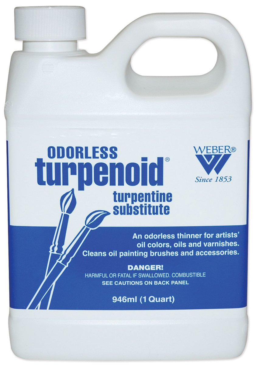 Turpenoid Odorless é um solvente inodoro substituto premium da terebintina. Muito volátil, fino e incolor, possui as mesmas propriedades de pintura e tempo de secagem da terebintina sem o forte odor. Pode-se usar o Turpenoid sem cheiro Weber como um veículo para tinta óleo e vernizes artísticos.